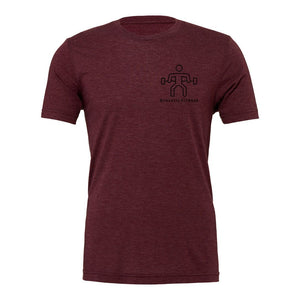 Athletic Fitness maroon tri blend t shirt with small left chest print and large back print in black print.