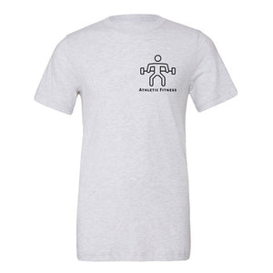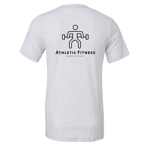 Athletic Fitness maroon tri blend t shirt with small left chest print and large back print in black print.