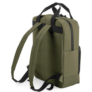 Insulated double adjustable strap backpack made from 100% recycled material. Fully wipeable liner. Top handle and smaller front pocket too.