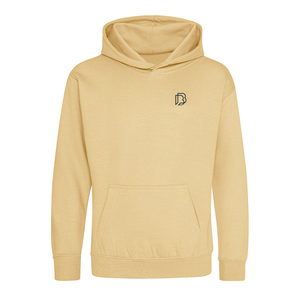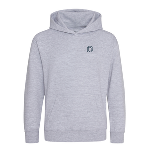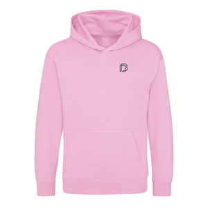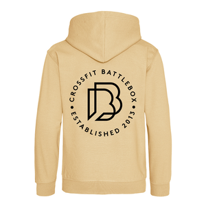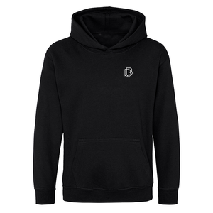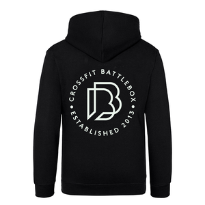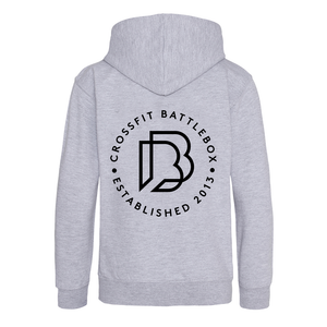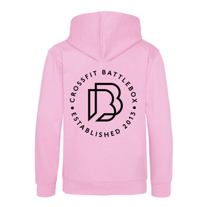 Children's pullover hoodie featuring the Battle Box small left chest and large back print.