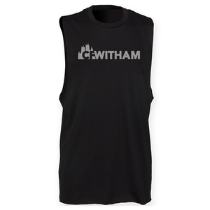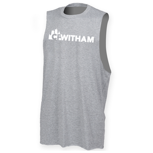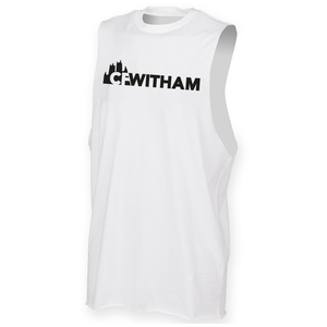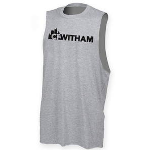 Mens muscle vest with deep arm holes featuring the CFWitham logo as a long chest print