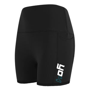 Ladies gym shorts featuring the YO4 logo on the left leg.