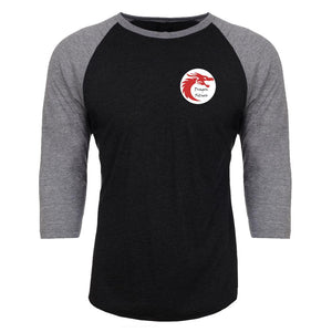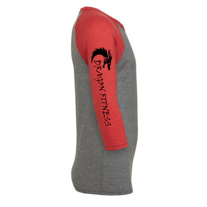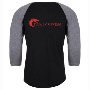 Unisex baseball top featuring the Dragon Fitness circle logo on the left chest, large back print and sleeve print too