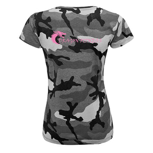 Unisex camo t shirt featuring the Dragon Fitness circle logo as a small left chest print and long logo across the back.