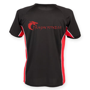 Polyester sports t shirt in black with red panels. Featuring the Dragon Fitness logos on the front left chest and back.
