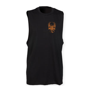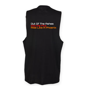 High neck deep slash arm holes vest featuring the Phoenix print on the left chest and Out Of The Ashes back print.